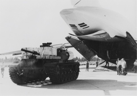 A U.S. C-5 Galaxy unloads an M-60 Patton tank at Ben Gurion International Airport during Operation Nickel Grass